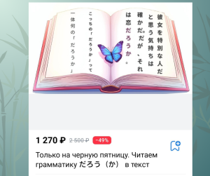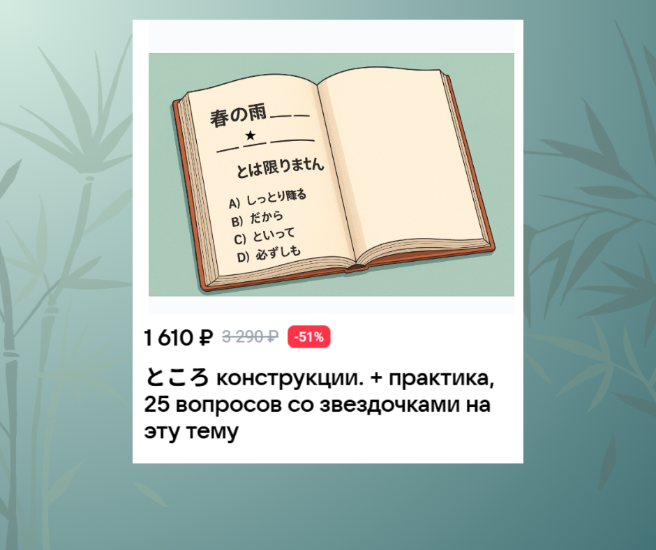 Также на черную пятницу возвращен материал по конструкциям ところ. 5(!) теоретических видео длительностью в несколько часов с разбором всех возможных фишек и подводных камней. + 1 имитационный тест-разбор на 25 (!) вопросов. Формат: грамматика со звездочкой.